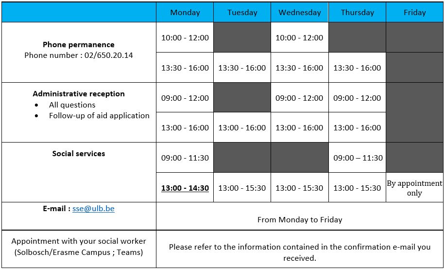 Other ULB financial aid services are offered to students, such as social grocery services, medical services, psychological support, family planning, Repair Café, and external partners.