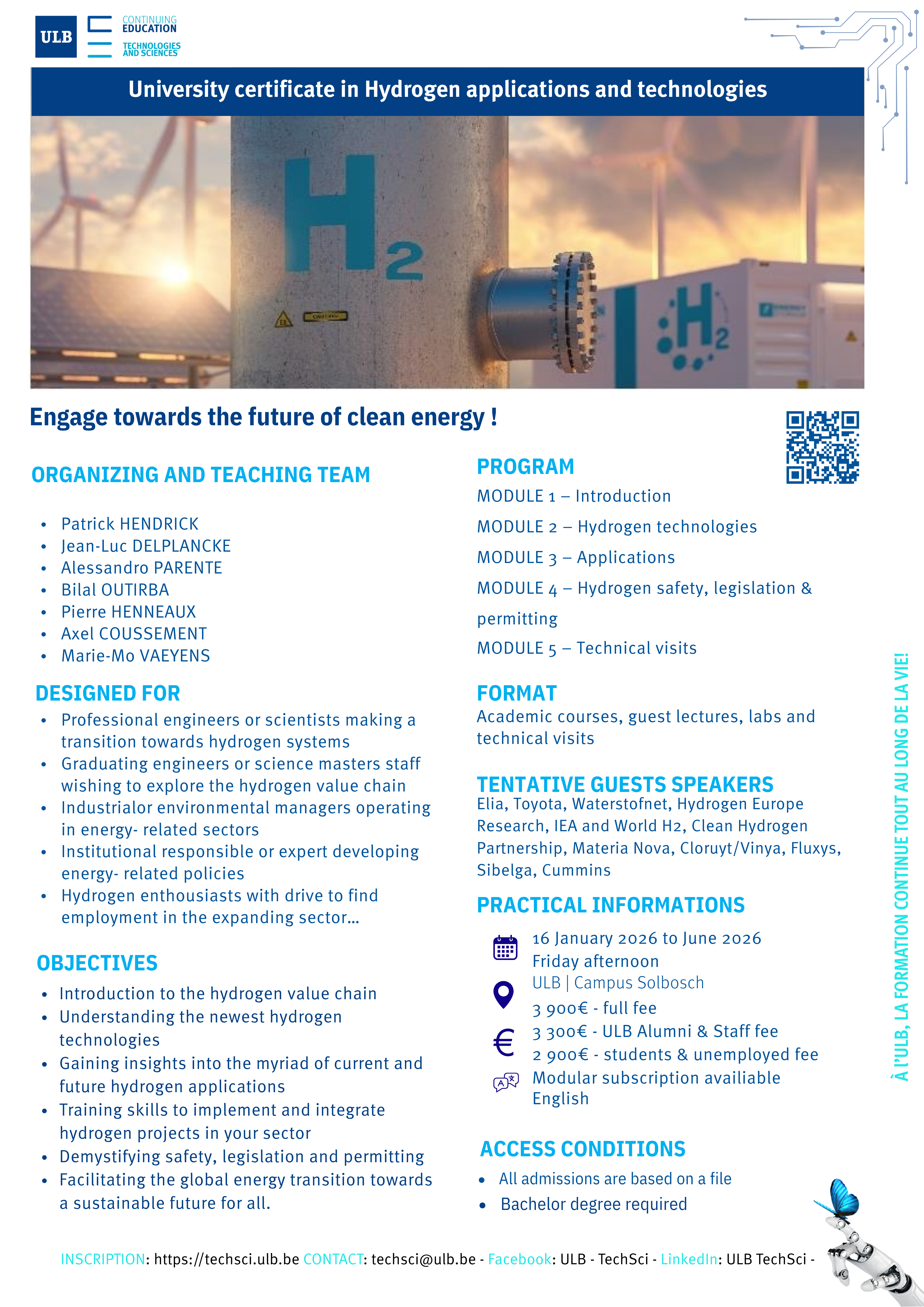 This lifelong learning program leading to an ULB certificate, aims to contribute filling in this gap. ULB has renowned hydrogen experts among its staff, actively conducts hydrogen research, has hydrogen related equipment, and has also a vast network of hydrogen related partners and consortiums.