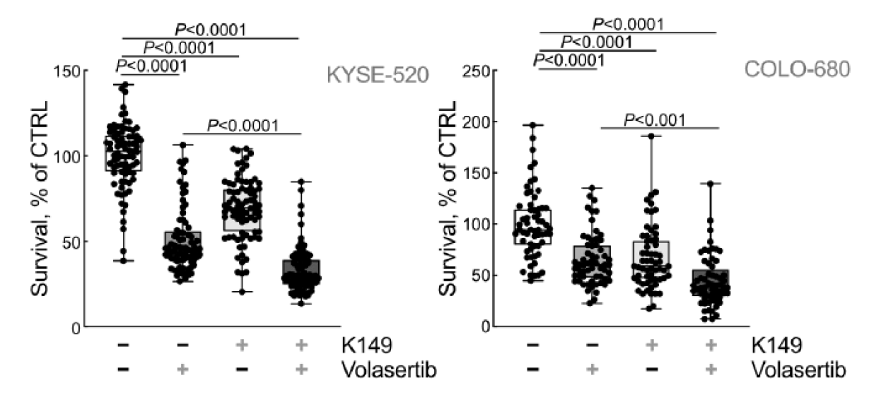 Percentage of eSCC cell survival measured after a 72-hour treatment with DMSO, K149, Volasertib or the combination of K149 (SHIP2 inhibitor) and Volasertib (PLK1 inhibitor) in cell lines KYSE-520 and COLO-680.
