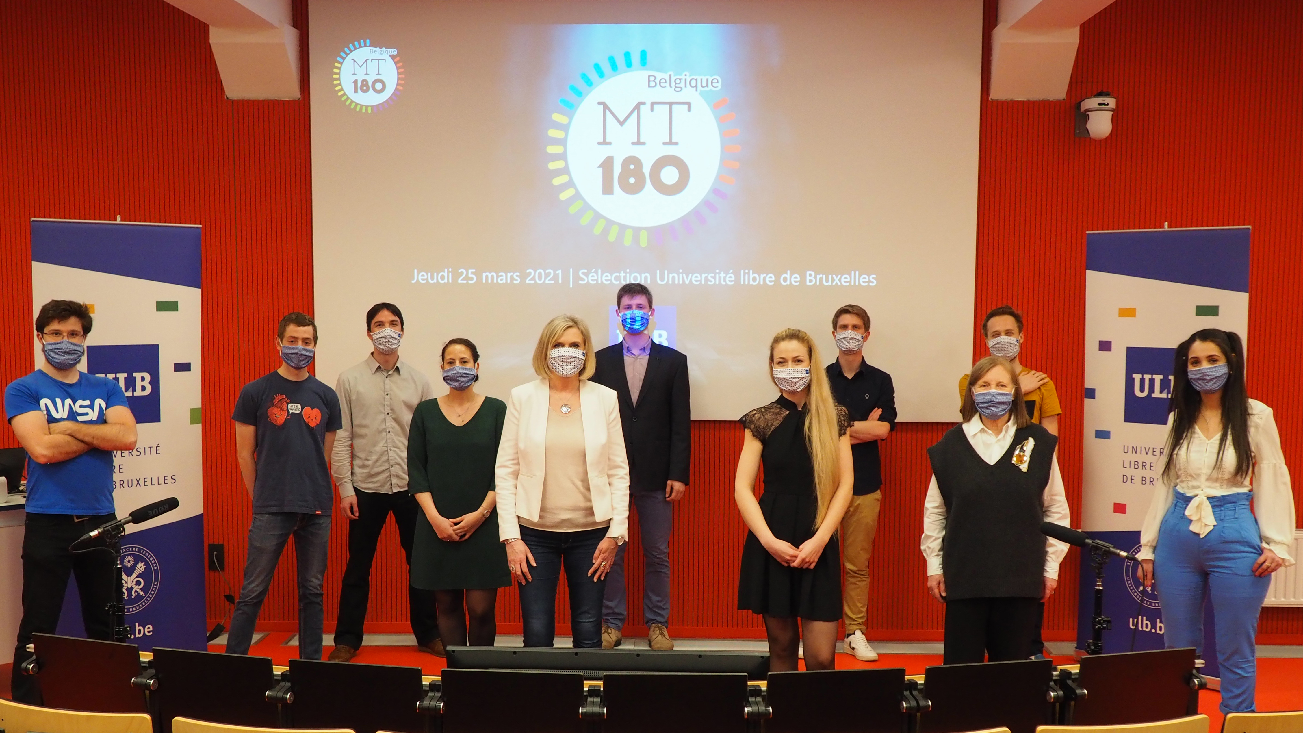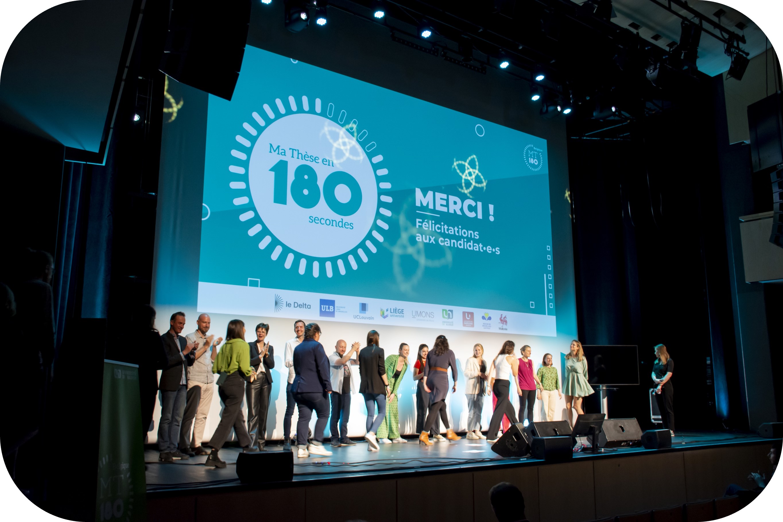 Ma thèse en 180 secondes (MT180) est un concours international francophone qui poursuit deux objectifs principaux : informer le grand public de la richesse et de l’intérêt des recherches scientifiques et développer les compétences communicationnelles des doctorant·es avec le grand public. Tout au long du concours, des doctorant·es de divers horizons présentent le sujet de leurs recherches au grand public et face à un jury de professionnel·les. Ils/Elles disposent d'une unique diapositive et de 180 secondes, pas plus, pour exposer le sujet de leur thèse de façon vulgarisée, ludique, mais néanmoins structurée et convaincante.