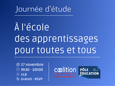 - À l’école des apprentissages pour toutes et tous5 septembre 2025Journée d’étude avec des parents, des enseignants, des chercheurs et des acteurs de terrain qui se réuniront pour réfléchir aux inégalités scolaires, se comprendre et envisager des voies d’action communes. Une co-organisation de la Coalition des parents de milieux populaires et des organisations qui les soutiennent et du Pôle Education de l'ULB.