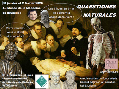 - Quaestiones naturales23 octobre 2025Deux matinées, 30 janvier et 2 février 2026, organisées par le Musée de la Médecine de Bruxelles (Campus Erasme ULB) et l'ACFLA-asbl, pendant lesquelles les élèves de 3e et 4e (option latine ou grecque) ont l'occasion de montrer que sciences et langues anciennes se complètent à merveille.