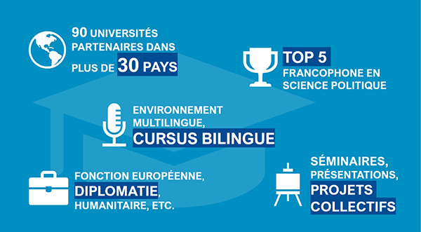 - une formation de base dans les différents domaines des sciences politiques : relations internationales, études européennes, politique comparée, administration publique et théorie politique;