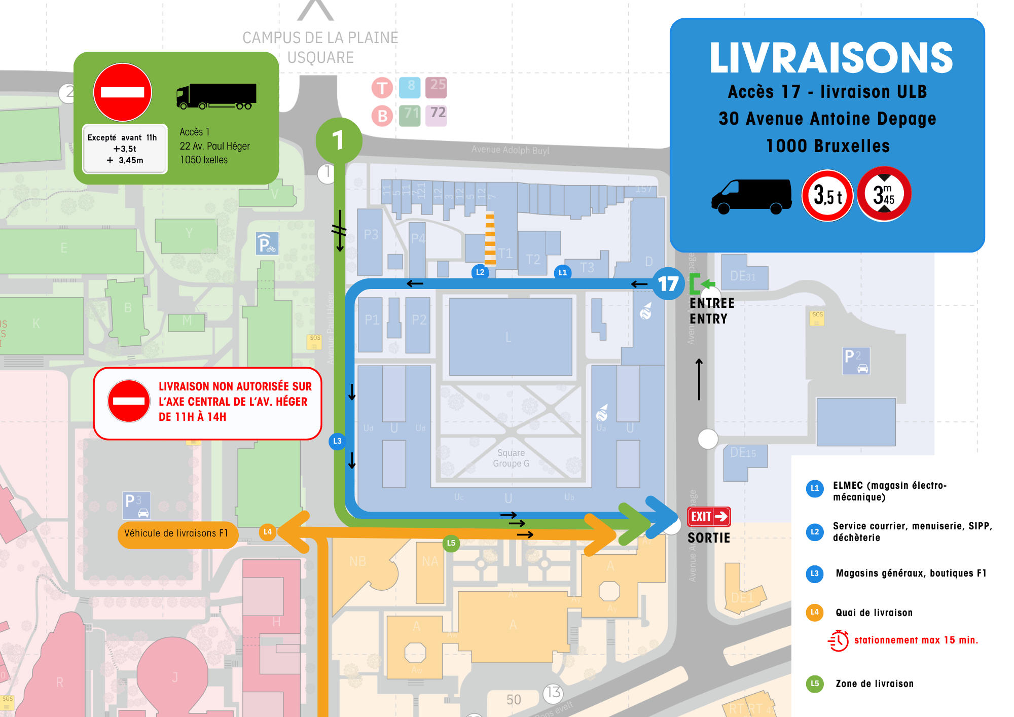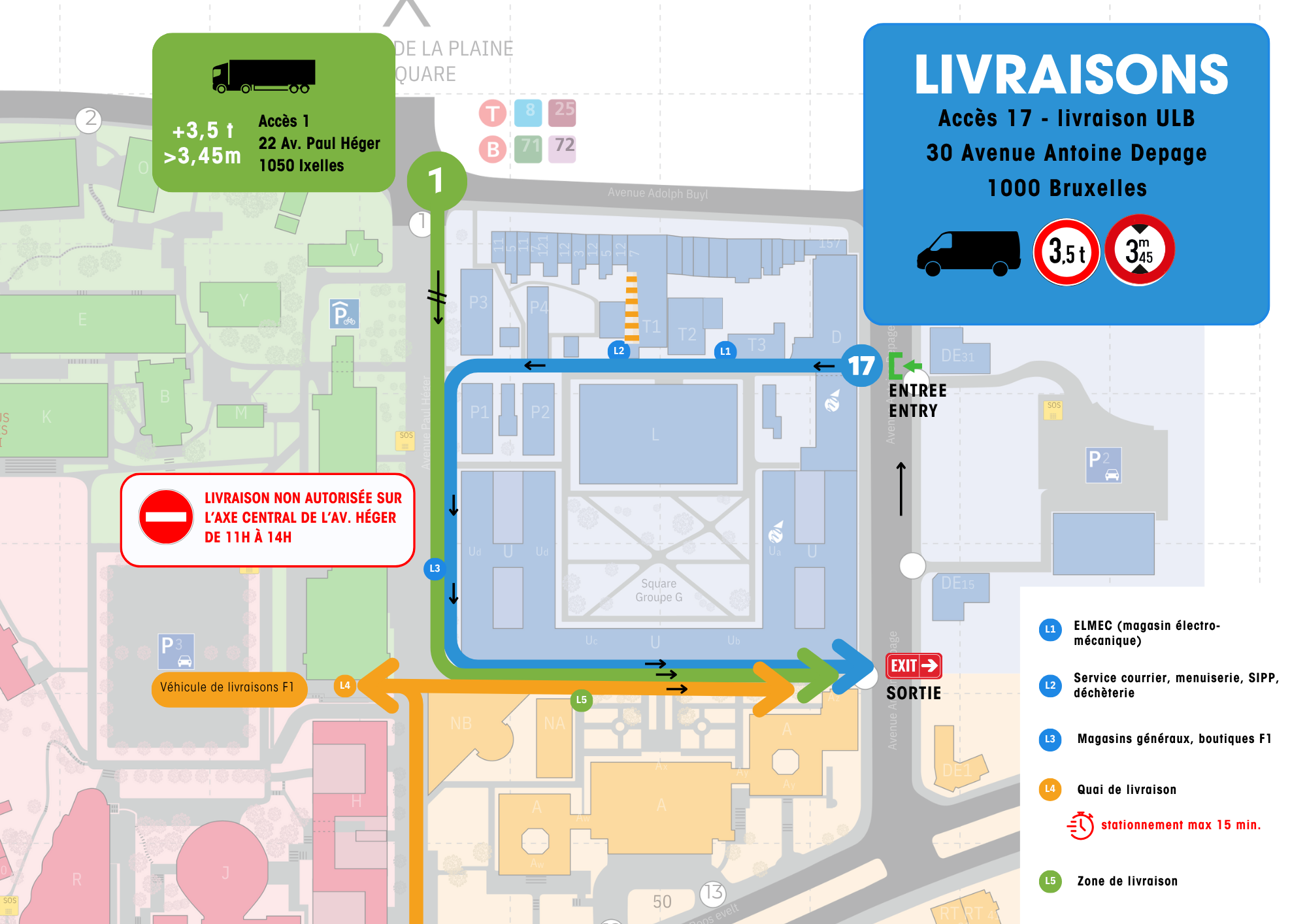 Accès 1 : 42, Avenue Paul Héger ( UNIQUEMENT AVANT 11h) pour les véhicules +",5T et +3,45m) - ligne verte Sortie = Accès 14 ( Avenue Antoine Depage)